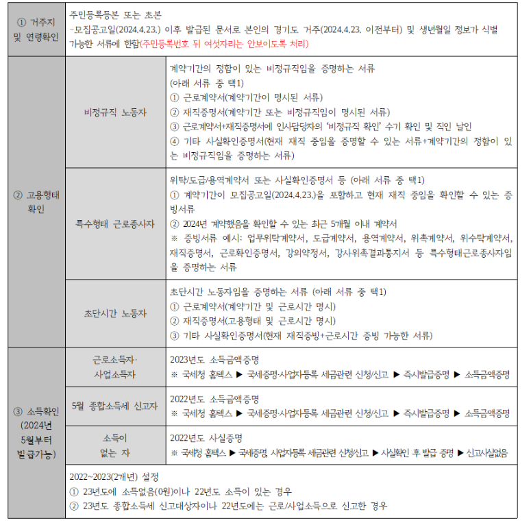 - 제출서류: 주민등촉등본 또는 초본, 고용형태확인 서류, 소득금액 증명 등