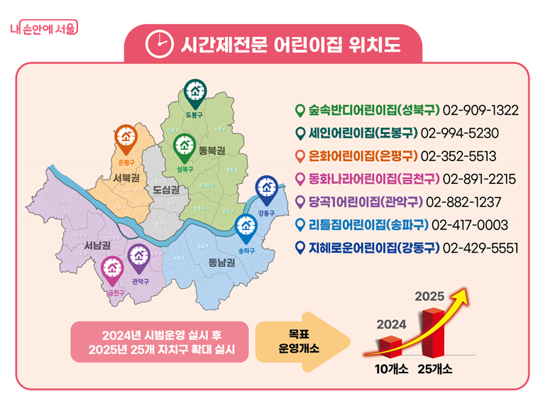 서울시는 영유아 및 미취학 아동 대상, 하루 최대 4시간, (월 60시간 보장), 잠깐씩 아이들을 맡길 수 있는 시간제 전문 어린이집 7곳이 발표되었습니다.