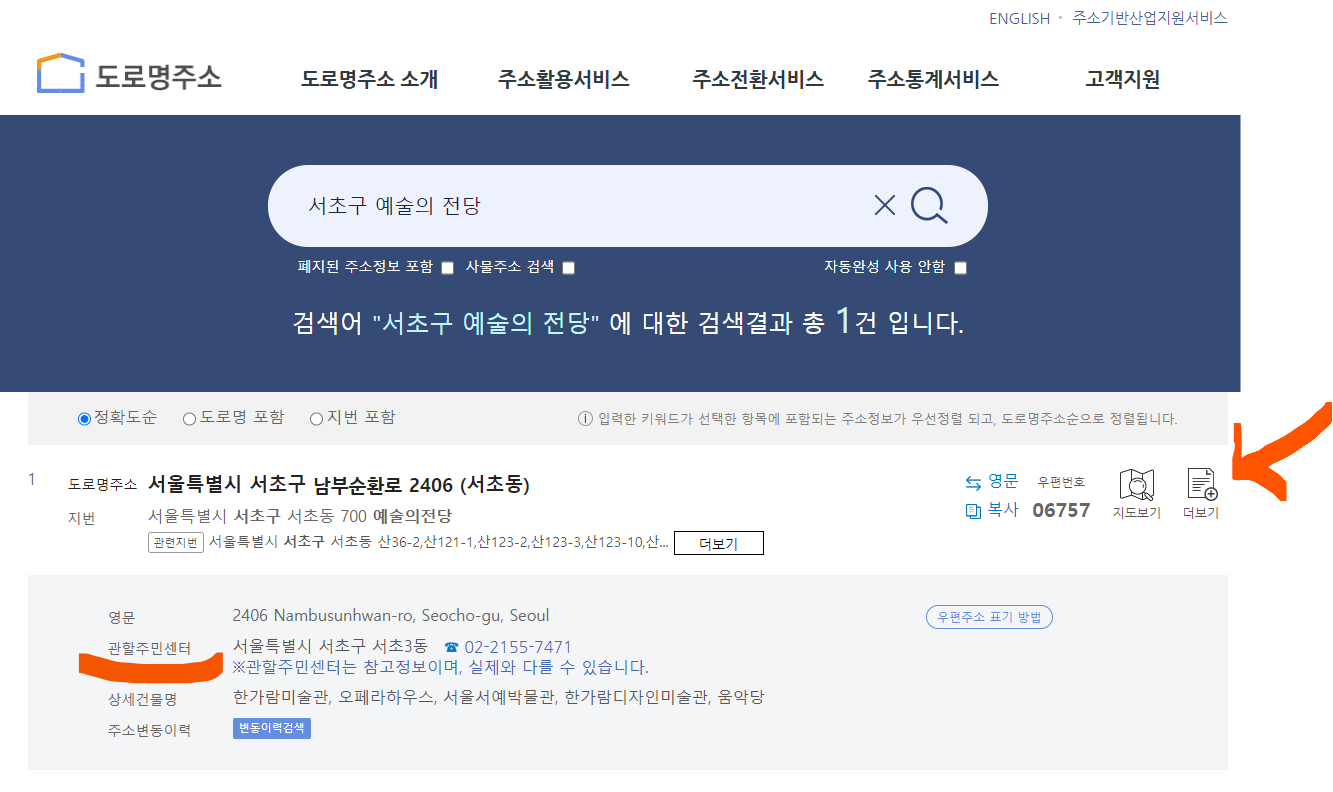 ※ 주민등록상 도로명 주소를 넣고 더 보기를 누르면 관할주민센터가 나옵니다