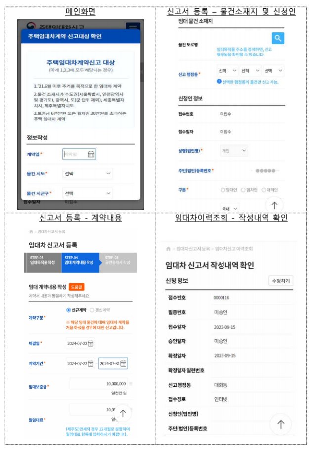 임대차계약 신고서 작성화면으로 이동-> 임대인과 임차인 정보, 임대차 계약 내용 등 입력