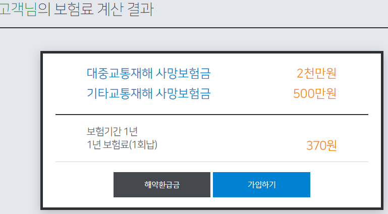 . 전 1년에 370원 내면 대중교통재해 사망금 2천만원, 기타 교통재해 사망보험금 500만원을 받을 수 있다고 나오네요.
